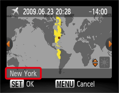 Operate the ⋖ directional buttons ⋗ left and right, or turn the ⋖ Control Dial ⋗ to select the world time zone ([New York] is selected in the above image).