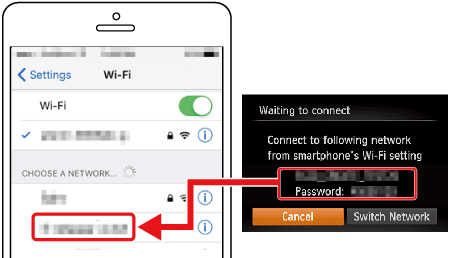 5. In the smartphone’s Wi-Fi setting menu, choose the SSID (network name) displayed on the camera to establish a connection. In the password field, enter the password displayed on the camera.
